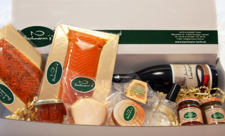 Bachmann`s Geschenkboxen mit Räucherlachs, Lachswein, Chutney & Lachsparfum
