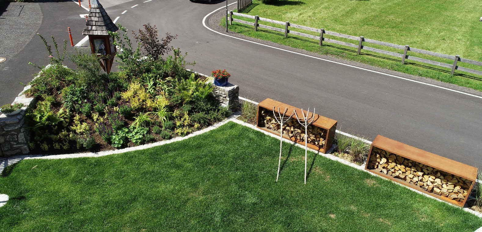 Die kompetenten Handwerker der Firma Wieser angefangen vom Garten-Landschaftsbauer ergänzt durch Maurer und Tischler errichteten eine Natursteinmauer, führten Natursteinpflaster-Arbeiten durch, definierten eine Abgrenzung zur Straße, erschufen einen Fahrradparkplatz, kümmerten sich um Gelände-Modellierungen, setzten eine Outdoorbeleuchtung, erbauten Dekorationselemente aus Cortenstahl und stellten ein Eingangsportal auf.