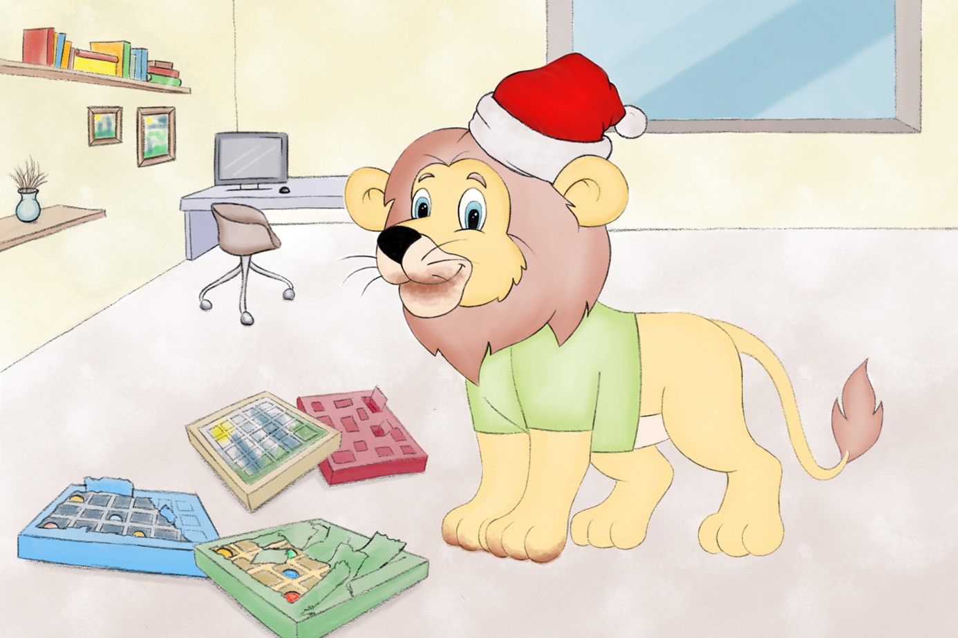 Sein guter Riecher führt ihn zu diesen bunten flachen Kartons mit den 24 Türchen. Sie duften herrlich süß und Ovita läuft das Wasser im Mund zusammen. Er reißt alle Kartons auf und isst die kleinen braunen zarten Milchschokoladen-Stückchen heraus. Das ist lecker, aber leider für eine ordentliche Löwenmahlzeit etwas wenig. Zum Glück, verrät ihm seine Nase: es gibt noch viel mehr von dem guten Zeug zu mampfen. Ovita folgt der verführerischen Spur durch viele verschlossene Türen und dicke Wände: